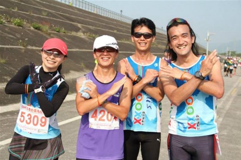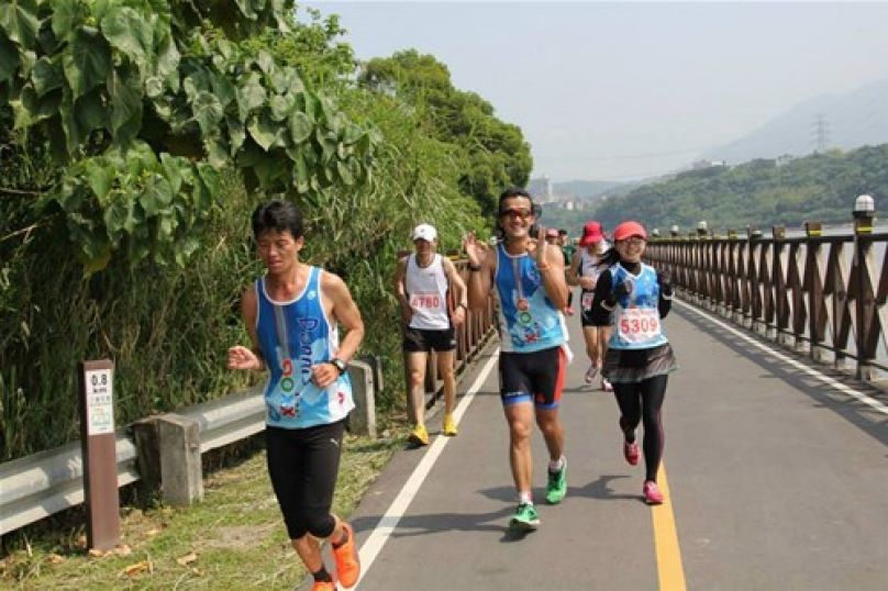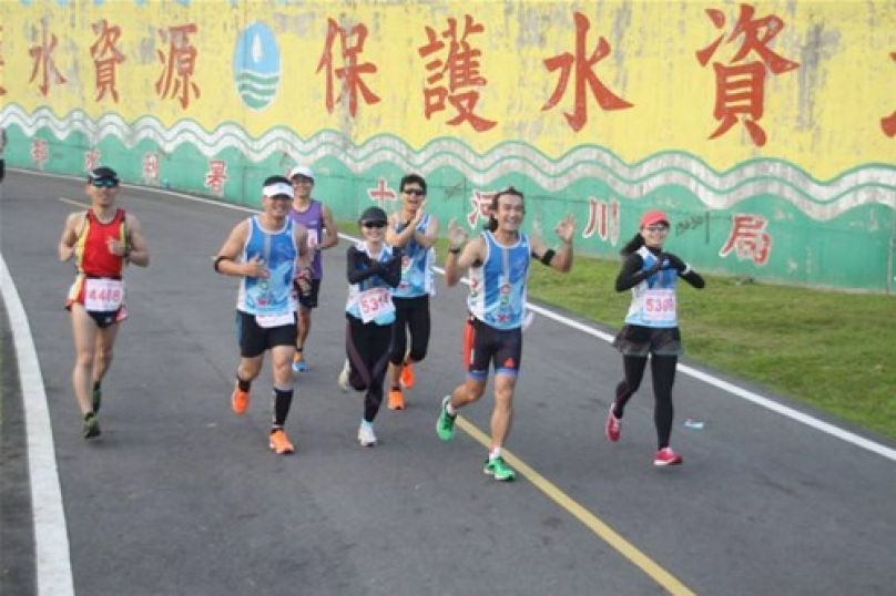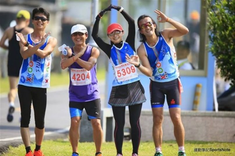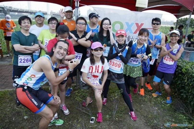 天氣越來越熱,本週三重馬,沒有晶片,賽道是狹窄的河濱,因此沒有想要衝速度(這麼熱,我也衝不起來吧!),與OOXX社友們閒聊時,決議這場就當來團練好了! 沒有壓力輕鬆跑,所以,在全馬跑者們正式起跑之際,我們還沒鄭世奇跑,拖了7分鐘才出去的好處是,起跑團體照非常清楚!