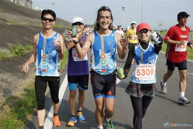 幸而卓木鳥早有準備冰涼啤酒,他跑回休息帳拿了冰啤酒,第二圈出發前,我們站在路邊就先喝了起來,天啊! 這種天氣跑步喝冰啤酒,真是太舒服了! 我開心的直說我在天堂~