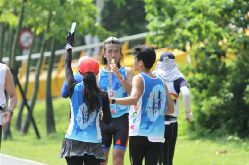 跑著跑著開始進入人群之中,速度也變慢了,跑神、卓木鳥與Syd突然開始幫身旁一位跑半馬的視障跑者及其領跑員開道,沿途幫忙出聲:「後面有視障跑者,請靠右!」,順利護送該名視障跑者回終點後,我開始覺得好熱,第二圈怎麼跑呀!?