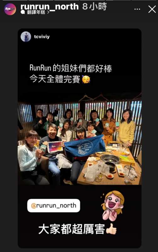 謝謝Run Run二位教練這幾個月持續的叮嚀和不放棄,我的跑速非常非常的慢,還是成功地初馬完賽!