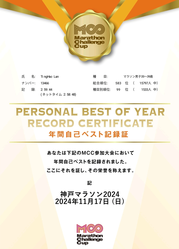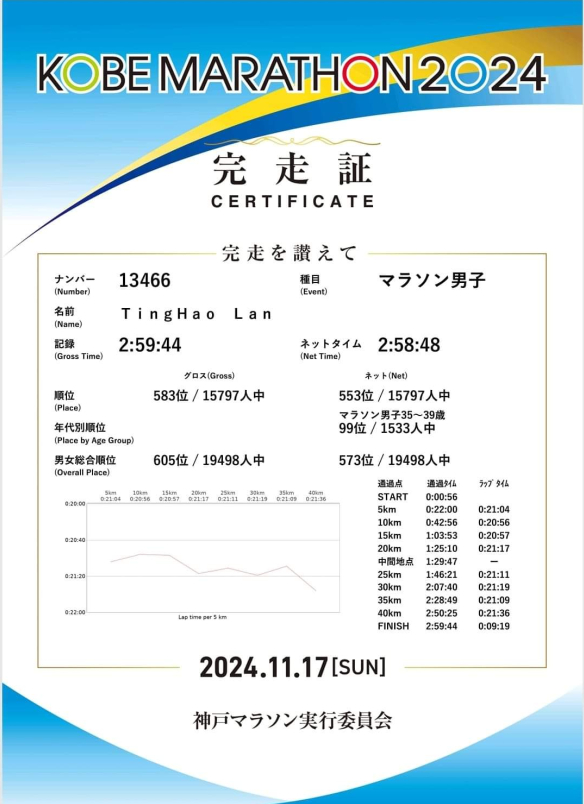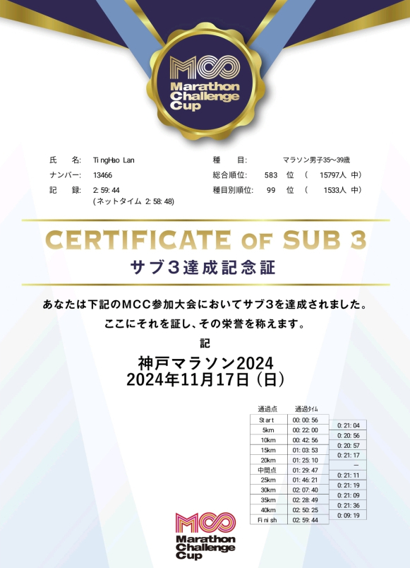 🙏相隔三年再次Sub3,對我的意義很大很大,甚至比我起初想得更重大,驀然回首已歷經三年,其間狀態起起伏伏,生活點滴在心頭。在賽道的半馬、30km、36km、神戶大橋面前,自我懷疑的念頭不曾消失,但每一次的起心動念,我都要自己相信這長達數個月的訓練下的堅持、夥伴們的支持、語嫣與家人的鼓勵。