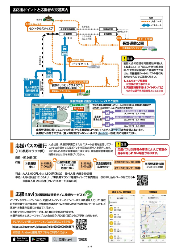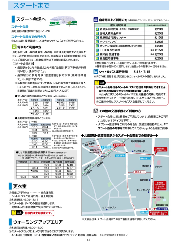 參賽者物資包含免費前往起點北長野站的電車票,進站出示、出站回收,以及完賽後從終點出發的接駁巴士,可選擇前往篠之井站或長野站,參賽者同樣出示物資車票即可免費搭乘。應援親友若要前往終點,可從篠之井站免費搭乘大會接駁車,回來時也可以自費300日圓搭乘,這點非常貼心,也不用擔心自行前往會有交通管制的困擾。