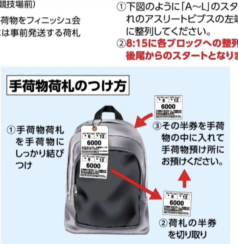 大會沒有發放寄物塑膠袋,只會給你寄物號碼牌,分成上下聯,上聯要綁在自己的私人包包上(包款不限),下聯則是放進包包裡,萬一上聯掉落的話用得到,我自己就是用台灣的衣保袋進行寄物。之前跑富士山馬跟神戶馬都是用大會的寄物袋,跟這次完全不一樣。