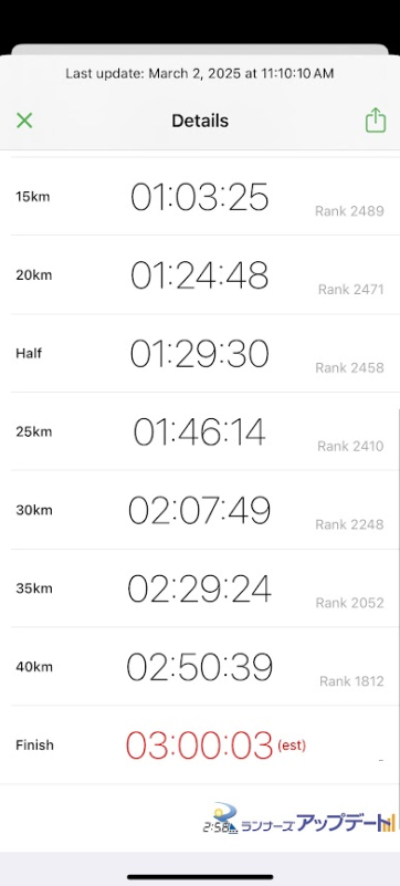 FINISH 3:00:36 (gun time) / 2:59:25 (chip time) / Lap 8:45