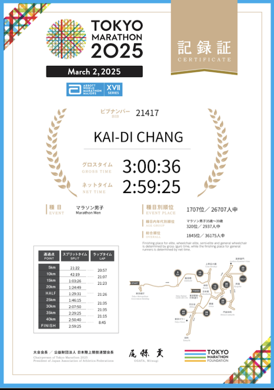 離場過程再看手錶,咦,個人時間有破三?驚喜意外,謝謝 32k 後沒有放掉、沒有變成觀光模式慢慢跑的自己,在本周最熱的比賽日,幸運完成首次海外馬破三,雖然大會時間沒破有點可惜,以這陣子的訓練狀態來說也很可以接受了。