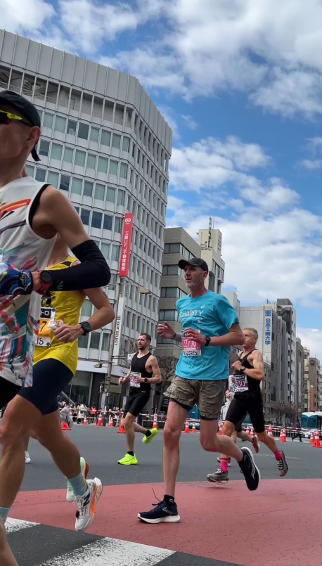 這段日曬最強烈的地方,默默在想我跟破三列車距離有多遠?怎麼好像一點也追不近。一邊想一邊持續奔跑著,終於來到 37.5k 左右的折返點,想說奇怪,有人說看到東京鐵塔就快到了?我已經完全無法注意到底東京鐵塔在哪裡。
