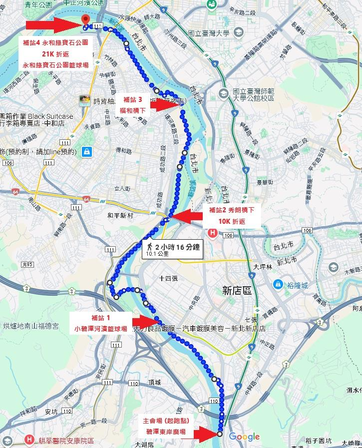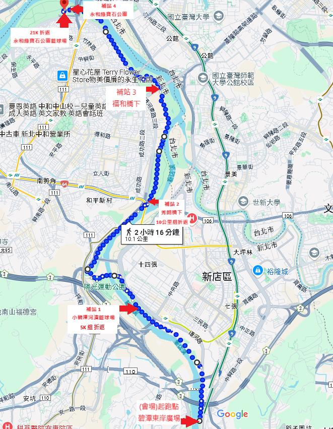 (起跑)新店區碧潭東岸廣場 → 碧潭堰魚道 → 小碧潭籃球場 → 陽光橋 → 陽光公園 → 秀朗橋 → 福和橋 → 永福橋 → 綠寶石運動公園(21k折返) → 綠寶石運動公園 → 永福橋 → 福和橋 → 秀朗橋 → 陽光公園 → 陽光橋 → 小碧潭籃球場 → 碧潭堰魚道 → 新店區碧潭東岸廣場(終點)