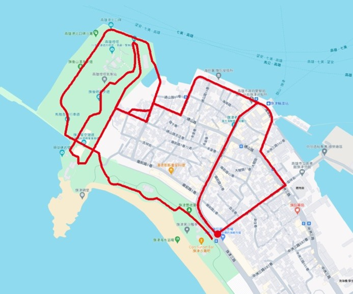 旗津豐收廣場(起點)→直行發祥街→左轉中洲三路→右轉大關路→接海岸路→右轉通山路→左轉文正巷→右轉通山路文正巷→左轉往砲台→沿砲台堡壘牆→直行至燈塔三叉路右轉→直行左轉旗下巷→左轉通山路84巷→沿堤防直行往星光隧道前進→出星光隧道往踩風大道→右轉步道→直行出采風大道右轉旗津三路→左轉旗港路→左轉中洲二路→直行中洲三路→右轉大關路→左轉廟前路→直行至旗津豐收廣場(終點)
