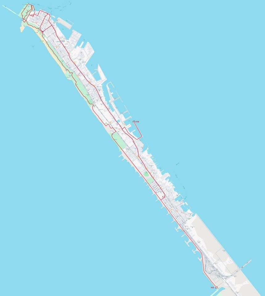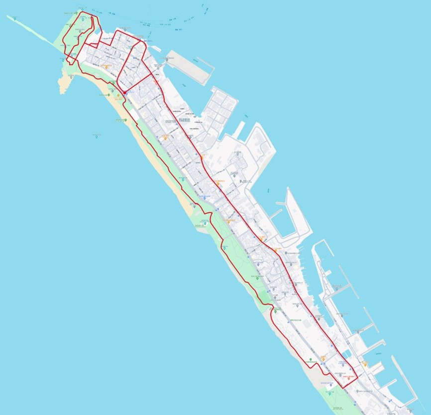 旗津豐收廣場(起點)→直行發祥街→左轉中洲三路→右轉大關路→接海岸路→右轉通山路→左轉文正巷→右轉通山路文正巷→左轉往砲台→沿砲台堡壘牆→直行至燈塔三叉路右轉→直行左轉旗下巷→左轉通山路84巷→沿堤防直行往星光隧道前進→出星光隧道往踩風大道→右轉步道→直行出采風大道右轉旗津三路→右轉風車公園停車場往踩風大道→直行至堤防末端折返→直行踩風大道→右轉堤防切口→接廣澤街進入廣濟宮前廣場→左轉旗津二路→直行右切中洲二路→右轉旗港路→右轉北汕巷底漁港折返→左轉旗港路→右轉中洲二路→直行中洲三路→右轉大關路→左轉廟前路→直行至旗津豐收廣場(終點)