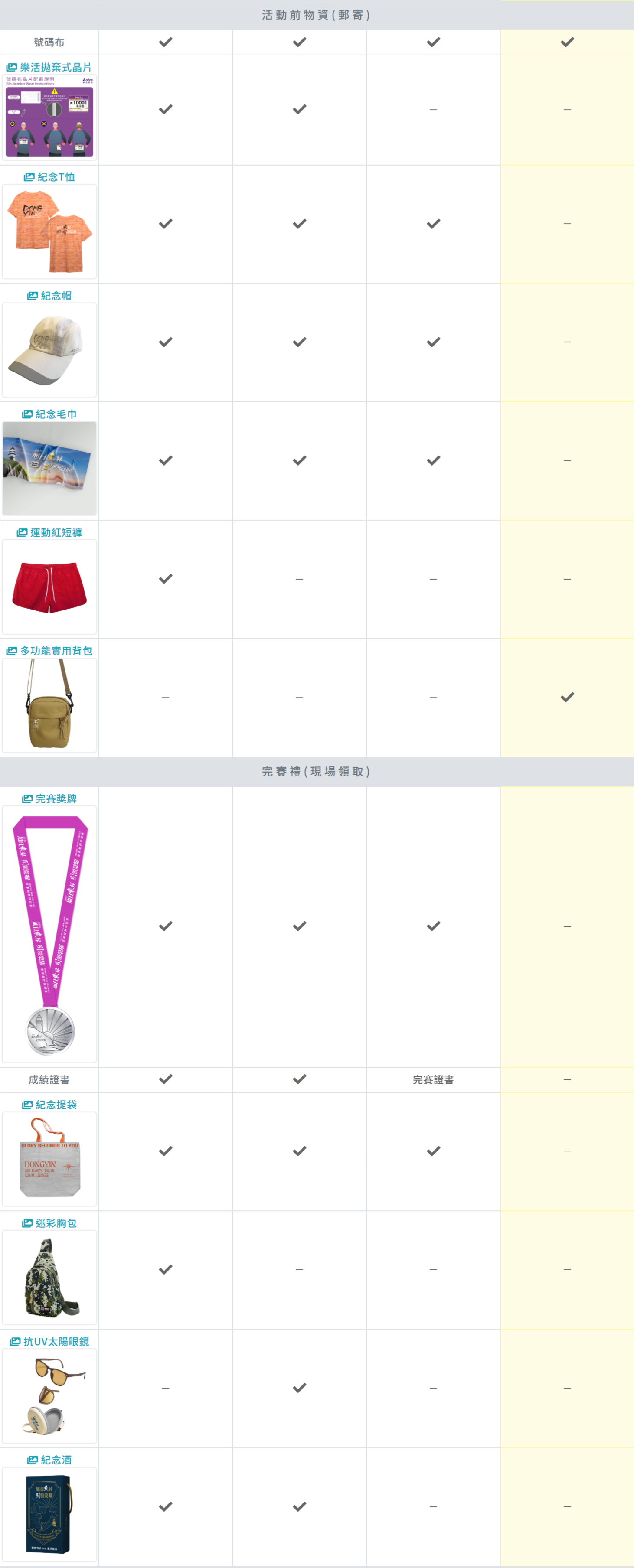 參賽贈品號碼布、樂活拋棄式晶片、紀念T恤、紀念帽、紀念毛巾、完賽獎牌、成績證書、紀念提袋、抗UV太陽眼鏡、紀念酒
