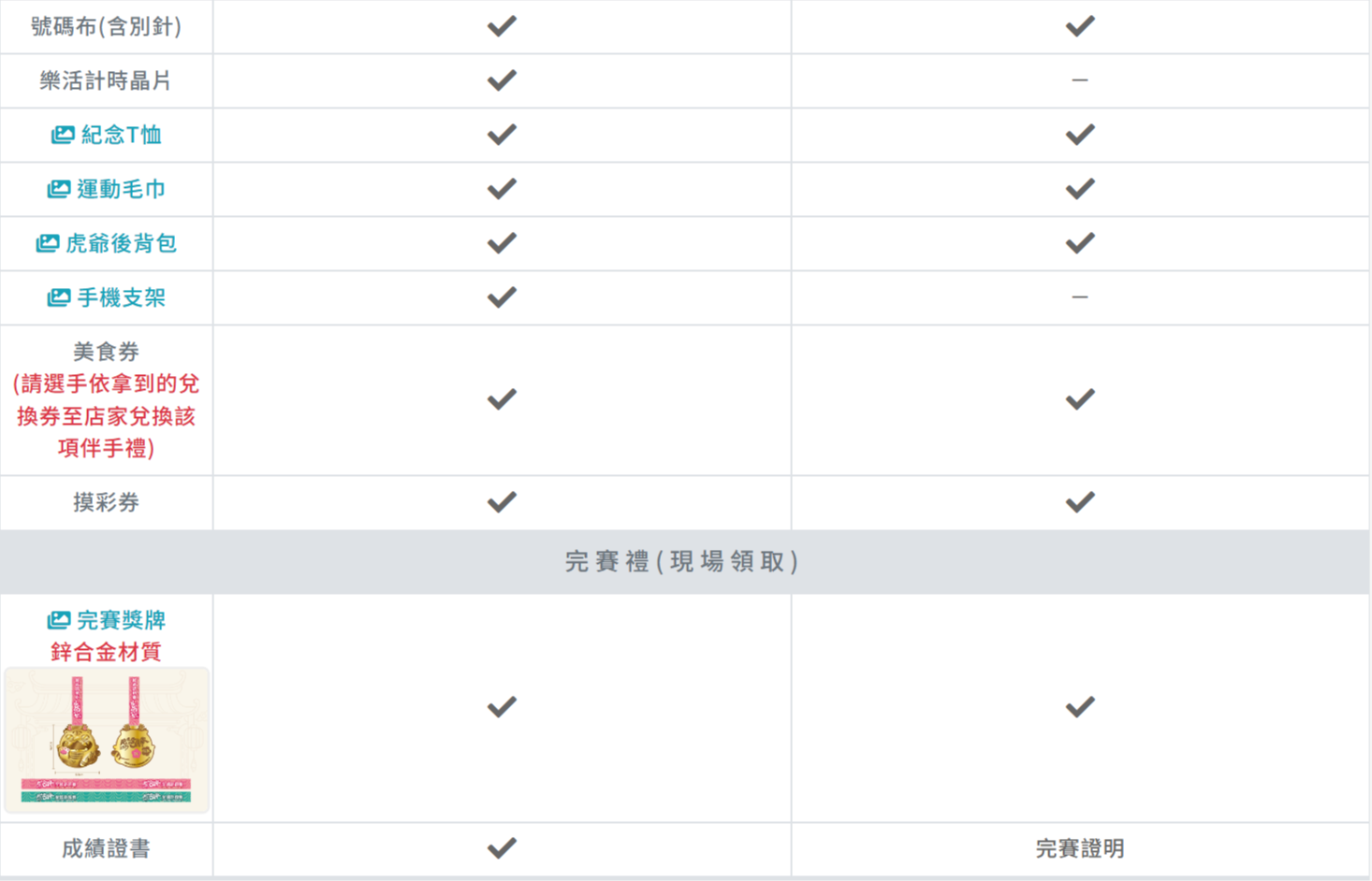 參賽贈品號碼布(含別針)、紀念T恤、運動毛巾、虎爺後背包、美食券、摸彩券、完賽獎牌、完賽證書