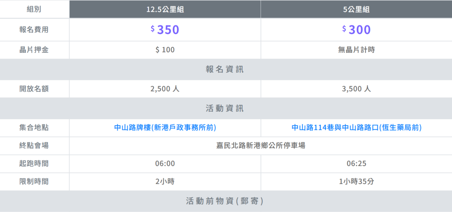 參賽贈品號碼布(含別針)、樂活計時晶片、紀念T恤、運動毛巾、虎爺後背包、手機支架、美食券、摸彩券、完賽獎牌、成績證書