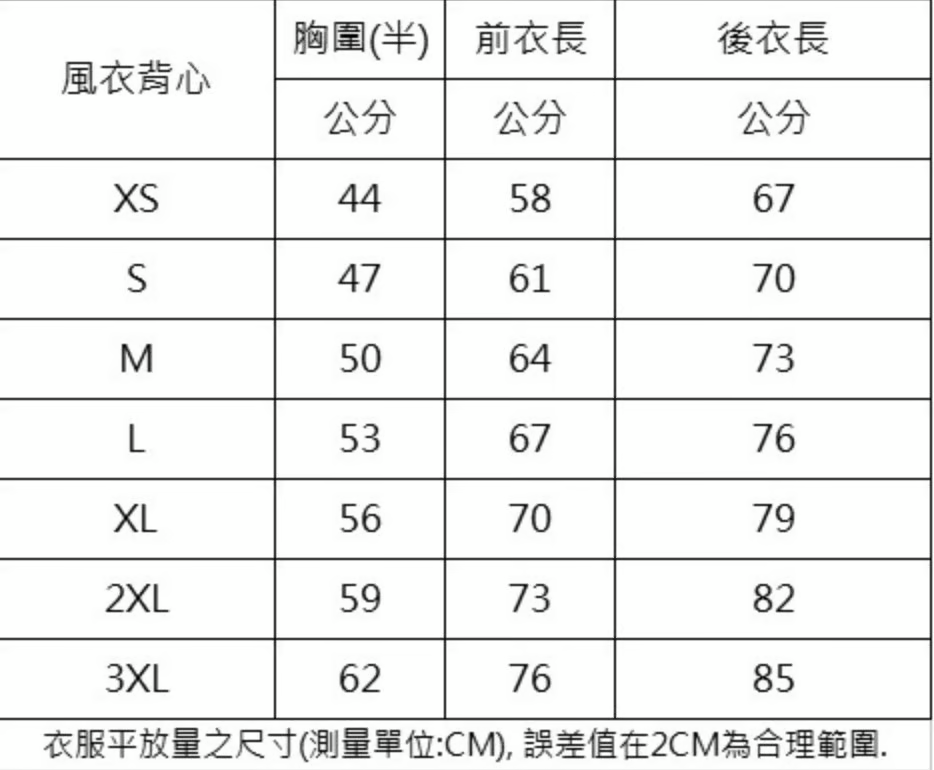 尺寸 XS S M L XL 2XL 3XL 胸寬 45.5 48 50.5 53 55.5 58 63 肩寬 42 44 46 48 50 52 56 衣長 65 67 69 71 73 75 78 袖長 20 21 22 23 24 25 26 活動車貼、帽貼