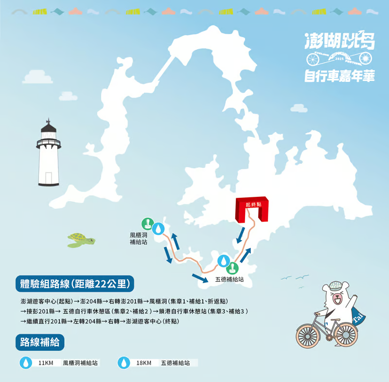 22公里休閒組澎湖遊客中心→澎204縣道→右轉澎201縣道往嵵裡國小→風櫃洞折返(11km處補給站1)→五德自行車休憩站(18km處補給站2)→澎201縣道左轉澎204縣道往澎管處→終點(完騎熱食區)。