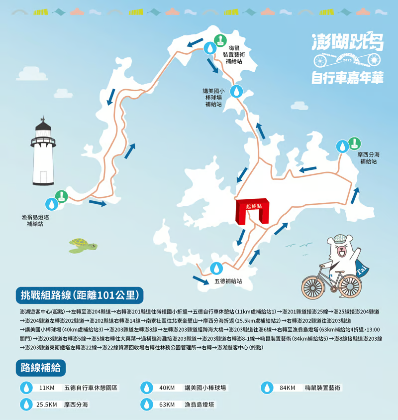 101公里挑戰組澎湖遊客中心(起點)→澎204縣道→右轉澎201縣道往嵵裡國小→五德自行車休憩站(11km處補給站1折返)→澎201縣道接澎25線→澎25線接澎204縣道→澎204縣道左轉澎202縣道→澎202縣道右轉澎14線→南寮社區往北寮奎壁山→摩西分海(25.5km處補給站2折返)→右轉澎202縣道往澎203縣道→講美國小棒球場(40km處補給站3)→澎203縣道左轉澎→左轉澎203縣道經跨海大橋→澎203縣道往澎6線→右轉至漁翁島燈塔(64km補給站4折返,13:00關門)→澎203縣道右轉澎5線→澎5線右轉往大菓葉→過橫礁海灘接澎203縣道→澎203縣道右轉澎8-1線→嗨鼠裝置藝術(84km補給站5)→澎8線接澎203線→澎203縣道東衛鐵塔左轉澎22線→澎22線資源回收場右轉往林務公園管理所→右轉澎管處→終點(完騎熱食區)。