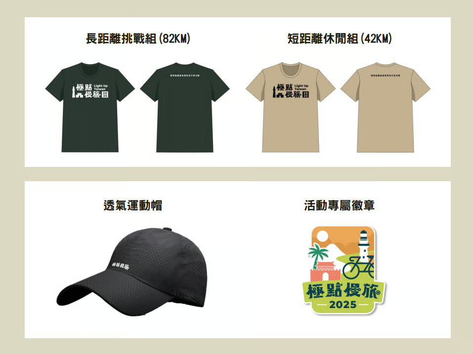 參賽贈品安全帽貼、紀念衣&水壺、馬鞍包、透氣運動帽、在地特產、2025極南點專屬徽章、完騎餐點、活動補給站 (水、運動飲料)、公共意外險