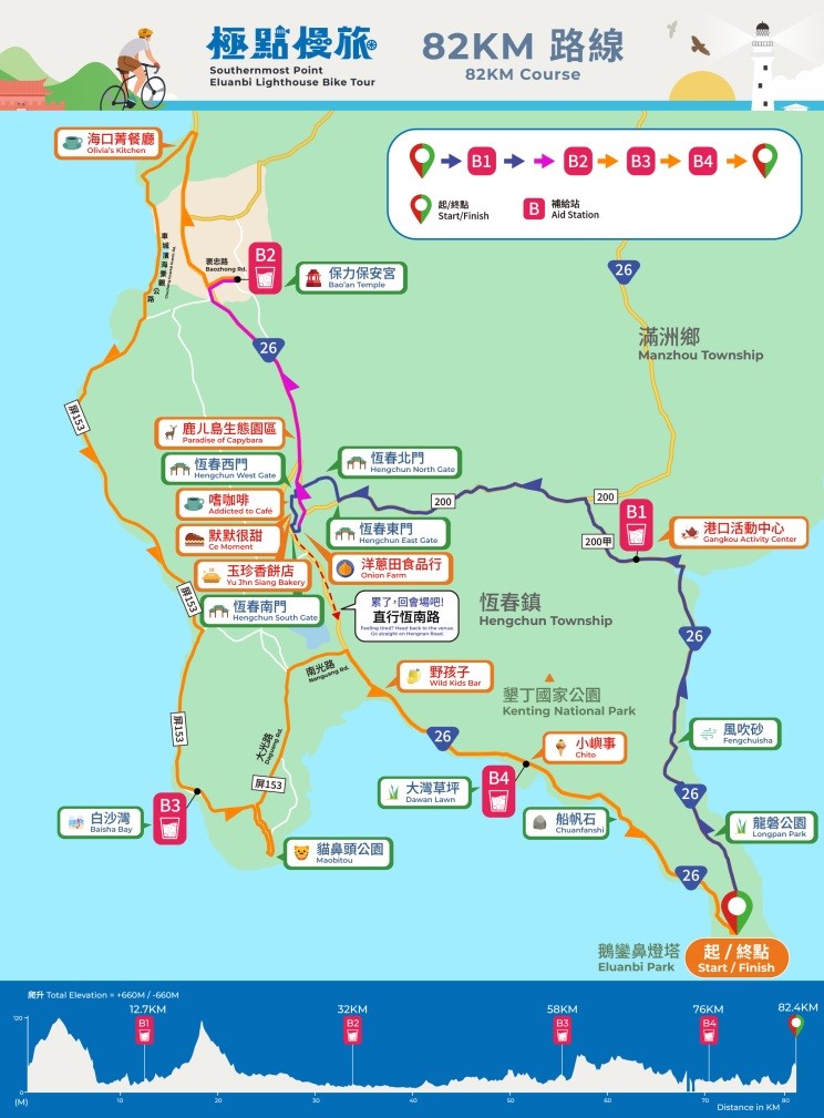 鵝鑾鼻公園(起點) → 龍磐公園 → 風吹砂 → 港口活動中心12.7KM(官方補給站) → 恆春東門 → 恆春北門 → 恆春西門 → 嗜咖啡 → 默默很甜 → 玉珍香餅店 → 恆春南門 → 洋蔥田食品行 → 鹿ㄦ島生態園區 → 保安宮32KM(官方補給站) → 看海美術館 海口菁餐廳 → 白沙灣58KM(官方補給站) → 貓鼻頭公園 → 野海子 → 大灣草坪76KM(官方補給站) → 小嶼事 → 船帆石 → 鵝鑾鼻公園(終點)