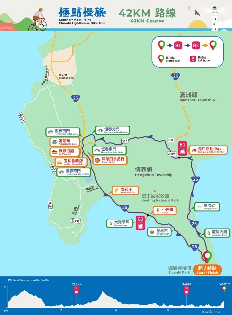 鵝鑾鼻公園(起點) → 龍磐公園 → 風吹砂 → 港口活動中心12.7KM(官方補給站) → 恆春東門 → 恆春北門 → 恆春西門 → 嗜咖啡 → 默默很甜 → 玉珍香餅店 → 恆春南門 → 洋蔥田食品行 → 野海子 → 大灣草坪34KM(官方補給站) → 小嶼事 → 船帆石 → 鵝鑾鼻公園(終點)