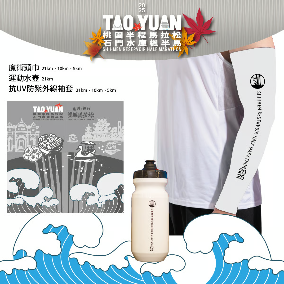 參賽贈品晶片計時、紀念衣、魔術頭巾、抗UV防紫外線袖套、摺疊購物袋、運動水壺、號碼布、運動毛巾、餐點、電子成績證明、獎牌