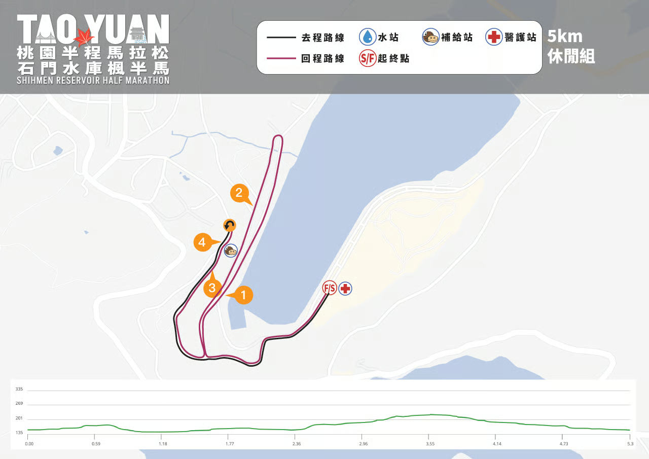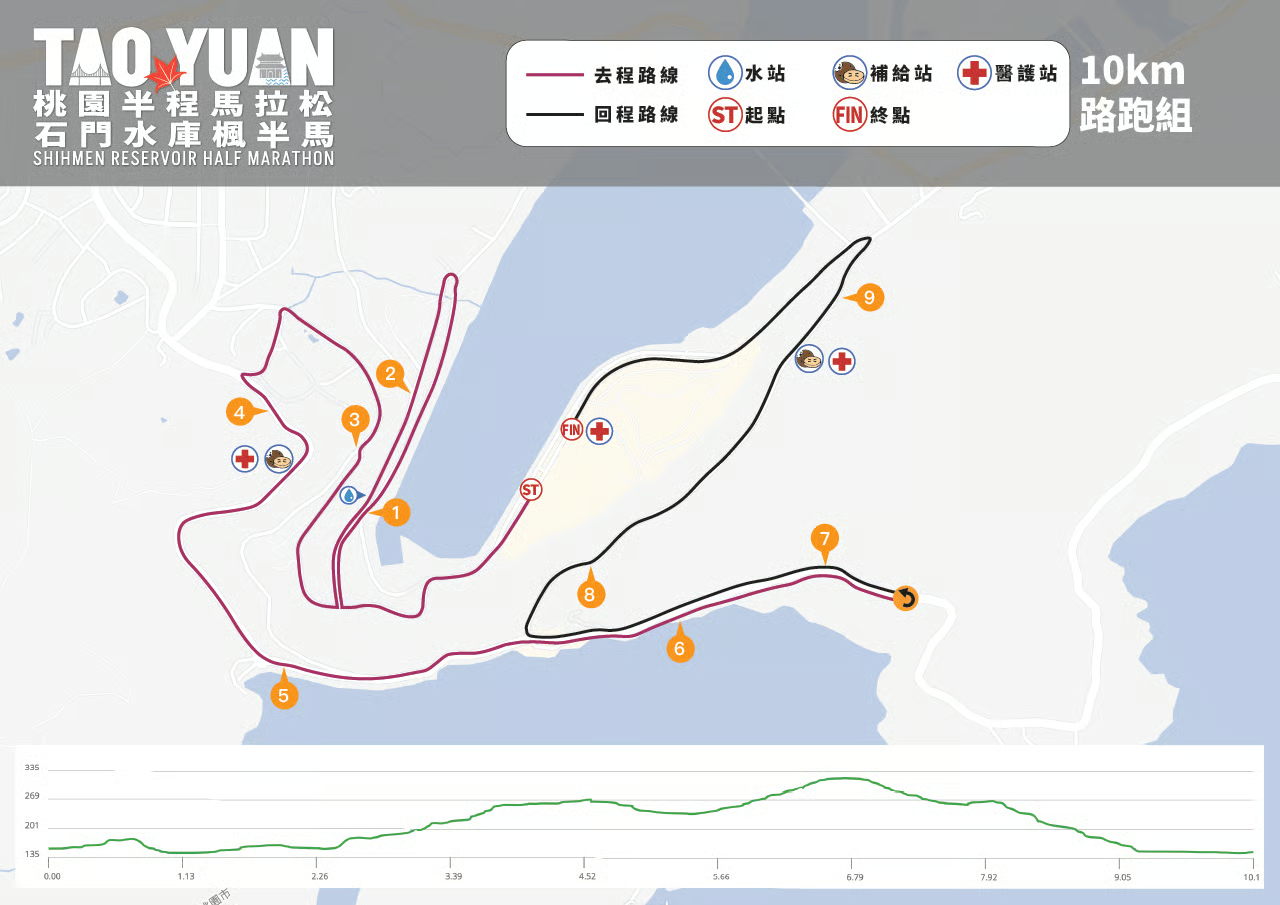 (4擇1)● ● ● 魔術頭巾 ● ● ● 抗UV防紫外線袖套 ● ● ● 摺疊購物袋 ● ● 大飲料提袋 ● 飲料提袋 ● 運動水壺 ● 號碼布 ● ● ● 完賽物資 運動毛巾 ● 毛巾 ● ● 餐點 ● ● ● 電子成績證明 ● ● ● 獎牌 ● ● ● 競賽路線 石門水庫南苑停車場→石門發電廠→槭林公園林道→民富街→左轉民強街→左轉民治路→嵩台→環翠樓→環湖路一段→環湖路二段→二層坪農路路口前折返→環湖路二段→環翠樓→右轉環湖路一段→坪林管制站→終點(南苑停車場) 石門水庫南苑停車場→石門發電廠→槭林公園林道→民富街→左轉民強街→左轉民治路→嵩台→環翠樓→環湖路一段→大灣坪管制站前折返→環湖路一段→環翠樓→右轉環湖路一段→坪林管制站→終點(南苑停車場) 石門水庫南苑停車場→石門發電廠→槭林公園林道→民富街→民強街口折返→槭林公園林道→終點(南苑停車場) 男版競賽排汗背心