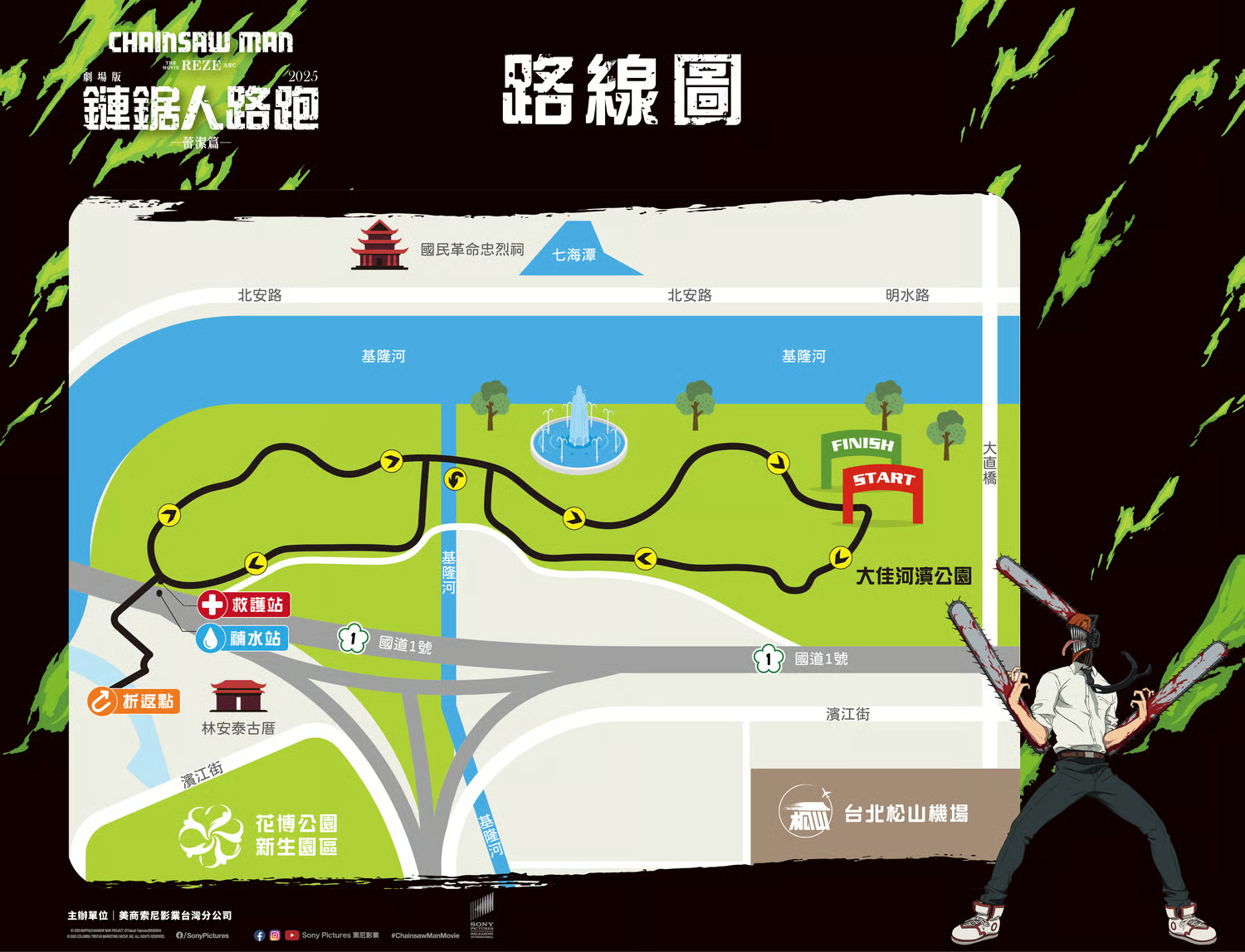 (未滿16歲選手需家長陪同及檢附家長同意書)活動組別 不分組 起跑時間 14:30 時間限制 2.5小時 報名好康與完賽禮項目 【劇場版『鏈鋸人 蕾潔篇』】電影預售票 號碼布 紀念衣 鏈鋸人獎牌(完賽禮) 完賽證書 3K蕾潔組 O O O O O