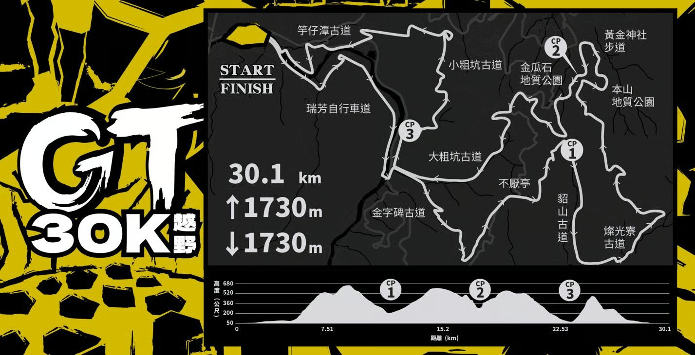 GT 30K越野競賽組 代號 地點 里程數 下一站距離 補站性質 關門時間 備註 SP 瑞芳國中 0k 8.5k 07:15 CP1 貂山古道口 8.5k 9.7k 補給站 09:30 CP2 金瓜石地質公園 18.2k 5.5k 補給站 12:00 CP3 小粗坑古道 23.7k 6.3k 補給站 13:30 EP 瑞芳國中 30.1k 15:00 賽事強制裝備強制裝備 / 組別 GT 30K