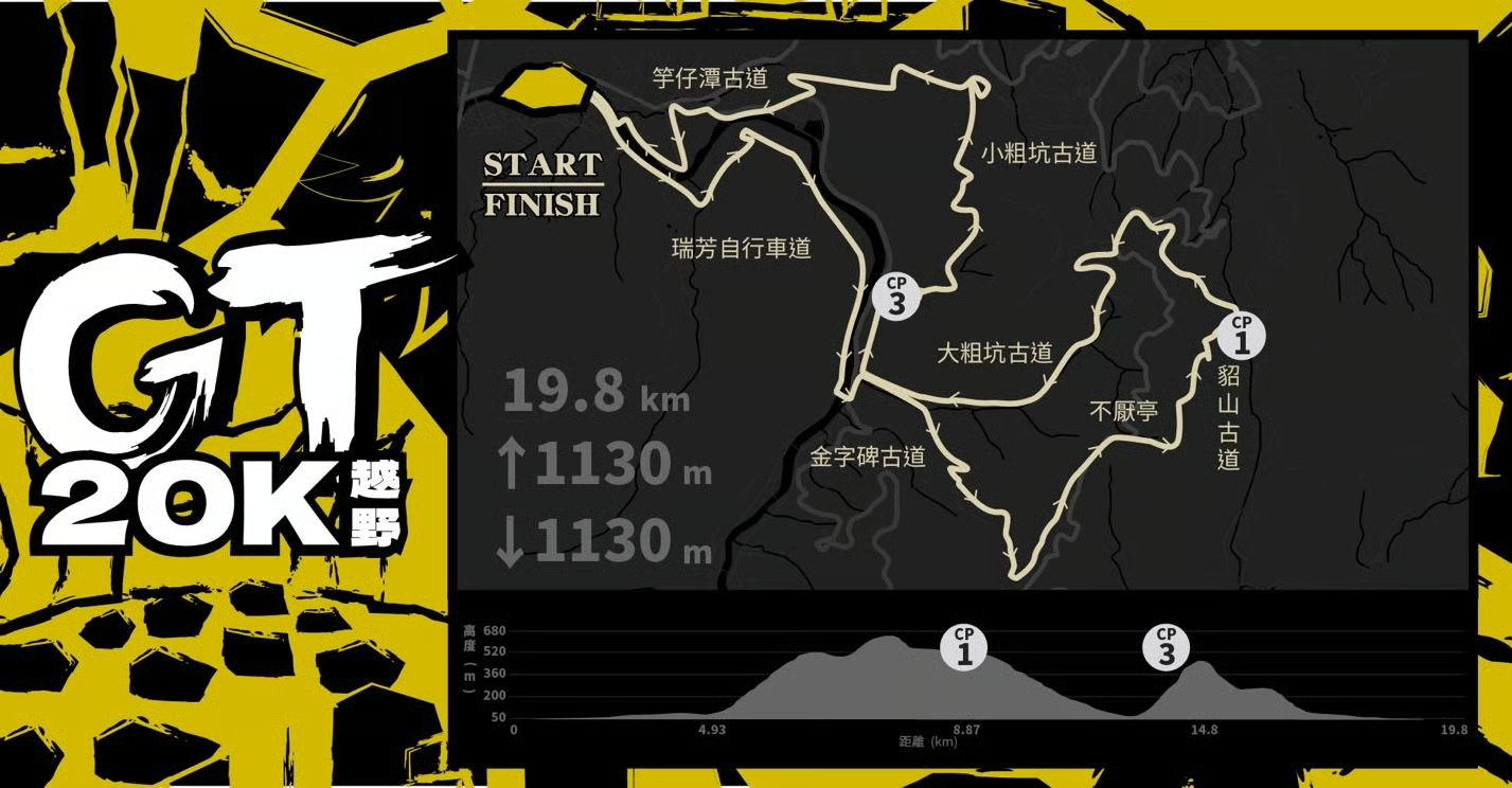 瑞芳國中>>瑞芳運動公園>>瑞猴自行車道>>金字碑古道>>不厭亭>>貂山古道CP1-8.5K >> >>草山戰備道>>大粗坑古道>>小粗坑古道CP3-13.4K>> 頌德公園>>琉瑯路步道>>竽仔潭古道>>福德宮>>明燈路一段45巷>>瑞芳國中GT 20K越野挑戰組 代號 地點 里程數 下一站距離 補站性質 關門時間 備註 SP 瑞芳國中 0k 8.5k 07:45 CP1 貂山古道口 8.5k 4.9k 補給站 10:30 CP3 小粗坑古道 13.4k 6.3k 補給站 12:00 EP 瑞芳國中 19.8k 13:30 【GT 30K越野競賽組】
