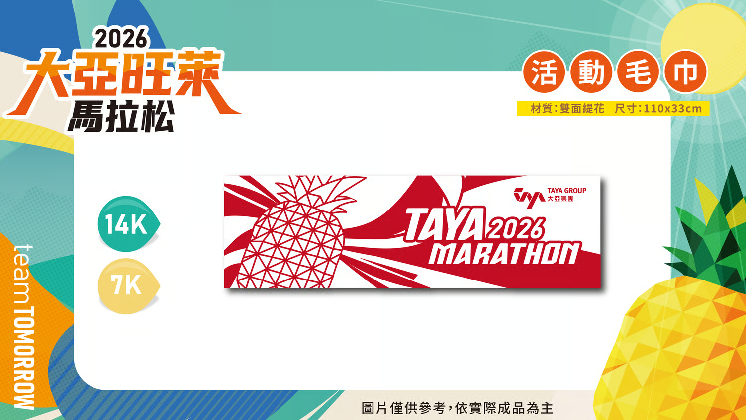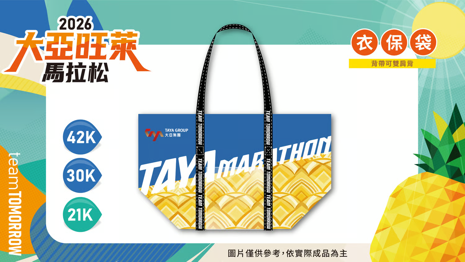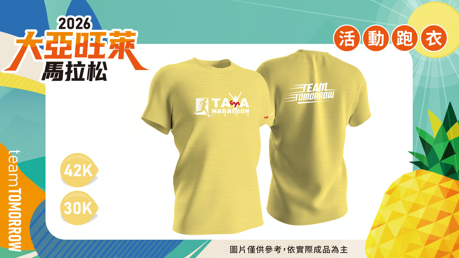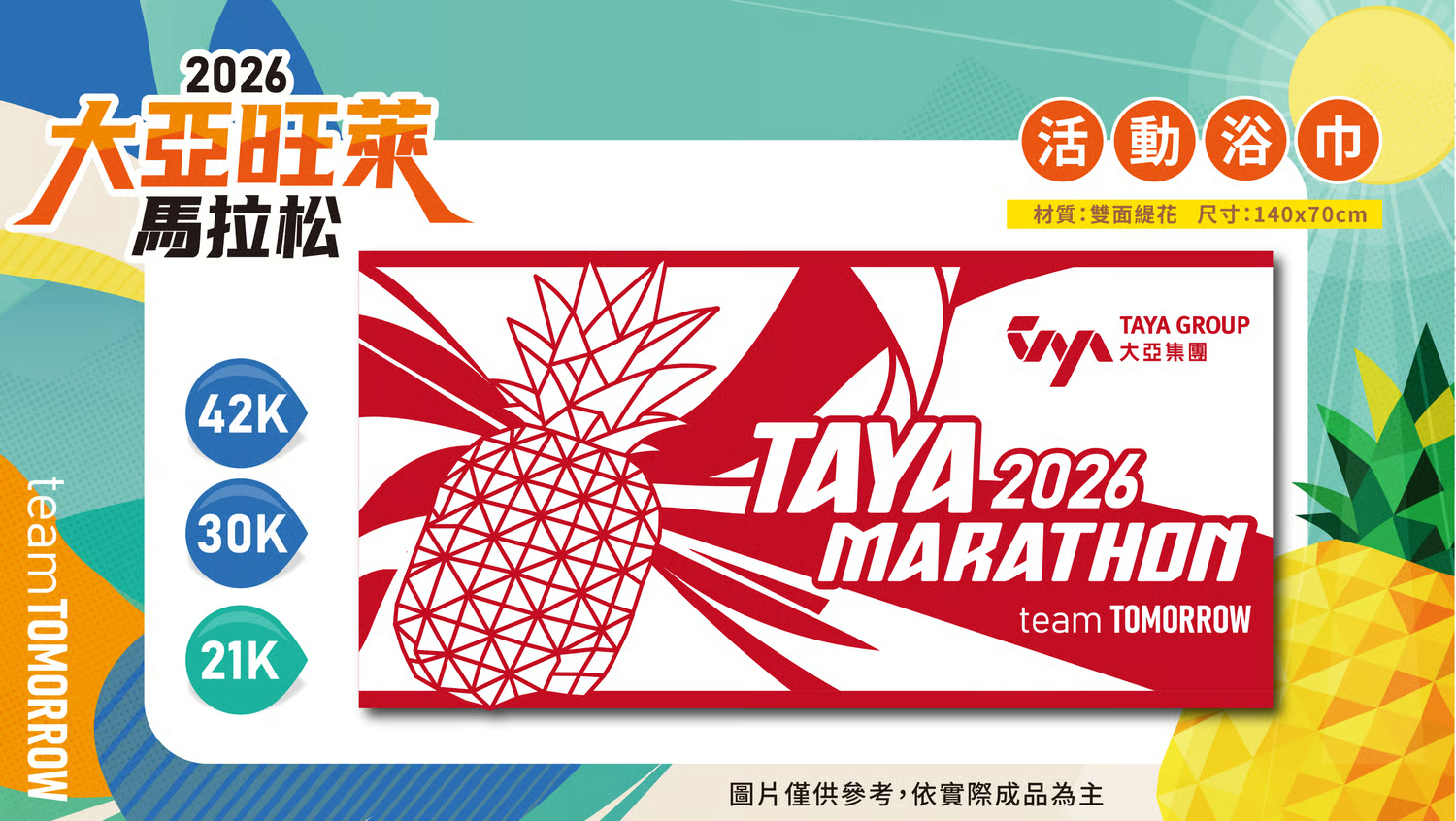 團體休息帳 只要滿40人(含)以上團體報名,不論是公司跑團、親友團…等都可以登記。申請方式:請將團報「訂單編號」及團報聯絡人個人資料,E-MAIL到 [email protected],我們就會為您登記,當天提供專屬團體休息帳篷。 創意造型獎 特別增設「創意造型獎」。參加對象不拘,活動當天開跑前請至指定集結位置作拍攝,並以「美麗家園、草鴞、旺萊」為造型主題,當天將選出5名最佳造型得獎者頒發獎盃。 跑者超越獎 凡報名2026大亞旺萊馬拉松,比2025大亞旺萊馬拉松參賽組別、距離增加挑戰者,於賽後完賽獎牌享有免費雷雕服務。 (組別依據,將以第二屆報名參賽資料data為對照依據)。 跑者突破獎 凡報名2026大亞旺萊馬拉松,於完賽成績比2025大亞旺萊馬進步者,於賽後完賽獎牌享有免費雷雕服務。(成績參考依據,將以第二屆完賽成績data為參考依據)。 報名好康與完賽禮項目 賽事紀念T恤 拋棄式晶片 號 碼 布 衣保袋 紀念帽 環保水杯 完賽 獎牌 電子 證書 完賽禮 終點 餐食 大 浴 巾 毛 巾 42K組 O O O O O O O O O O O X 42K組