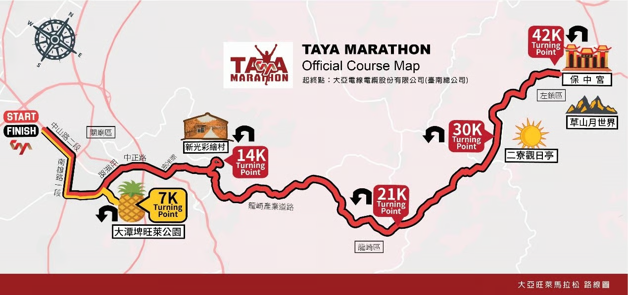 (起點) 大亞電線電纜股份有限公司(臺南總公司)→【右轉】中山路二段→【右轉】南雄路一段→【左轉】旺萊路→【右轉】中正路→【左轉】新光街→【左轉】彩繪村→【左轉】南161鄉道→【直行】龍崎產業道路→【折返點】臺南二寮觀日亭→原路線回程→大亞電線電纜股份有限公司(臺南總公司)(終點) - 大亞半馬組(21K)