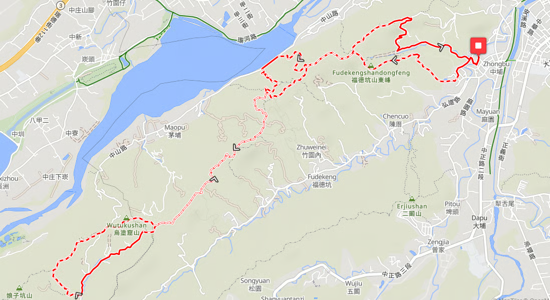 路線說明:中園國小>>鳶尾山步道>>福德坑山東峰>>鳶山>>彩壁>> >>五十分山>>CPB 6.8K>>娘子坑山步道>>烏塗窟山>>五十分山>> 永安宮登山步道>>CPA-13.8K >>螢火蟲小吃 >>鳶山>>鳶山大鐘>>大同路 240 巷>>鳶尾山步道>>中園國小