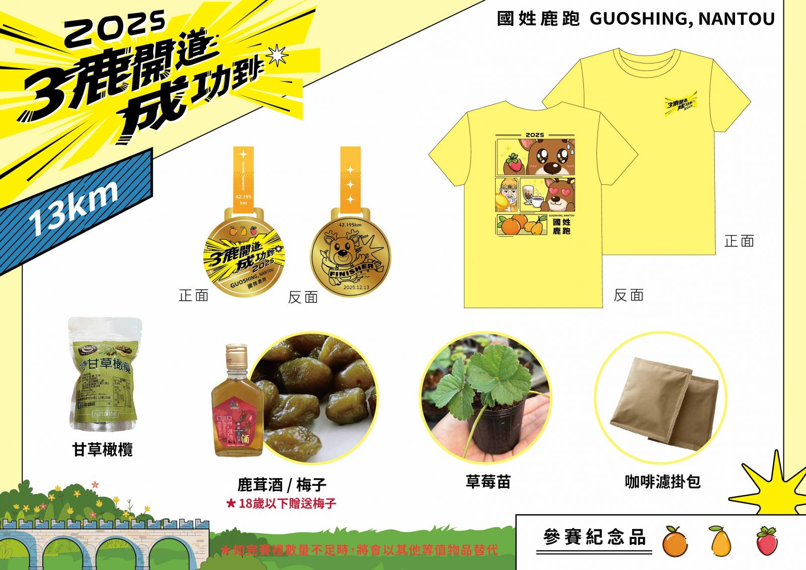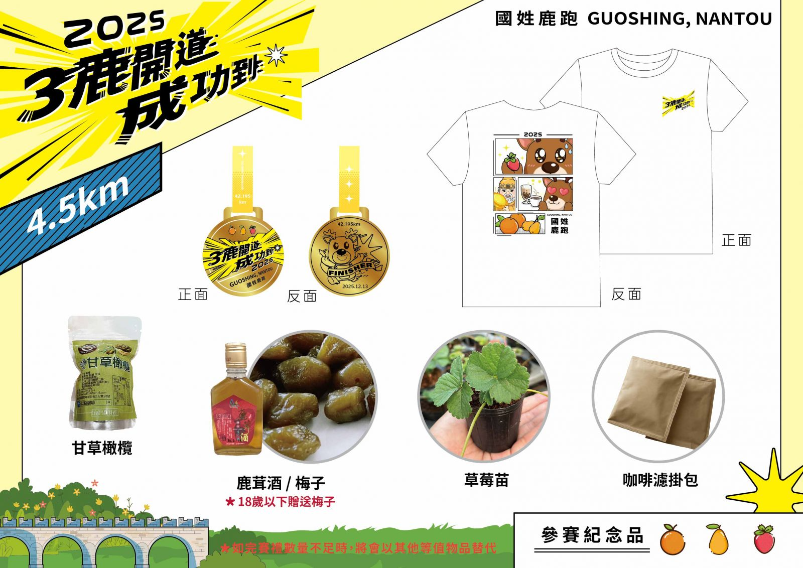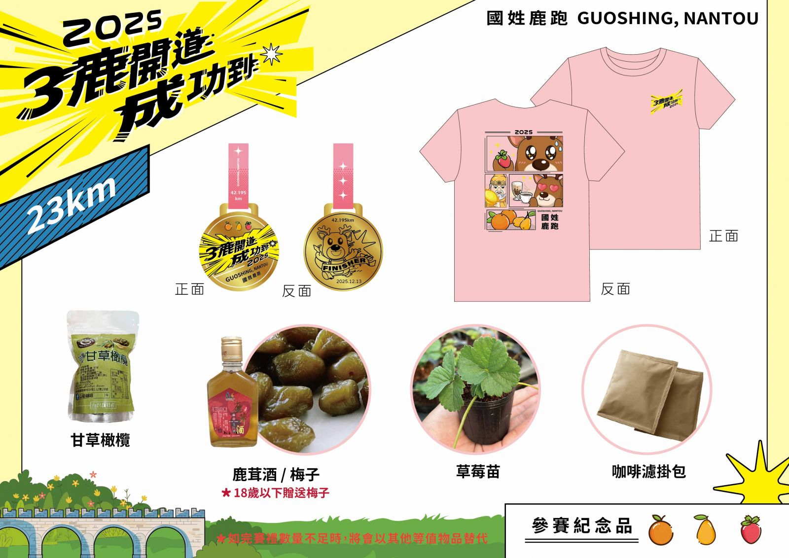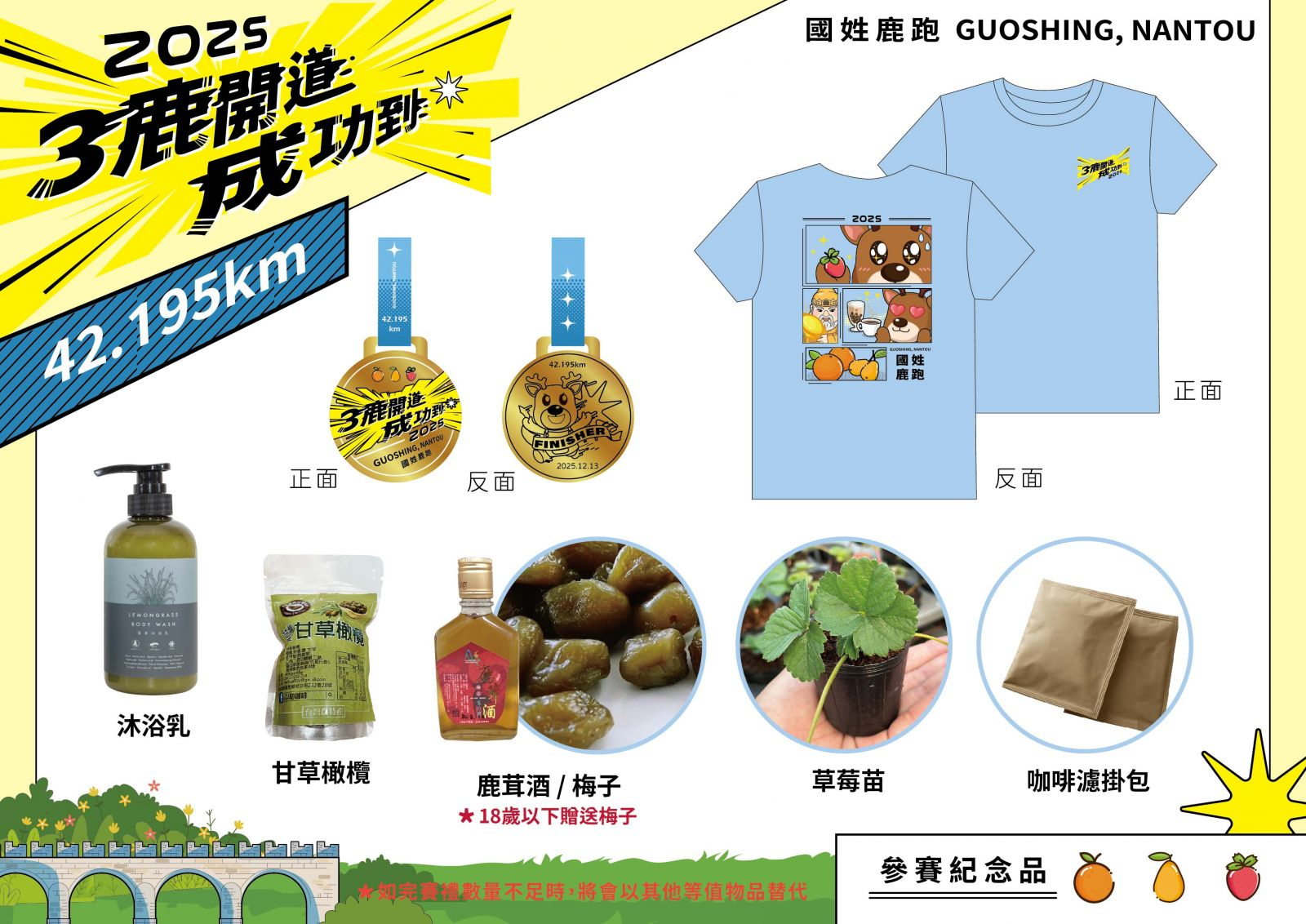 參賽贈品紀念衣、完賽獎牌、成績證明、草莓種苗小盆栽、客製化提袋、餐券、國姓鹿茸酒+濾掛式咖啡(二選一)