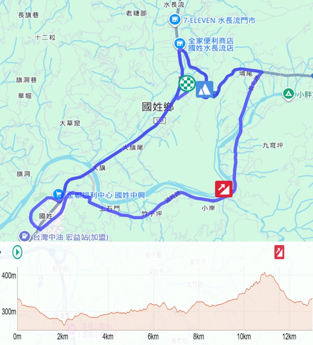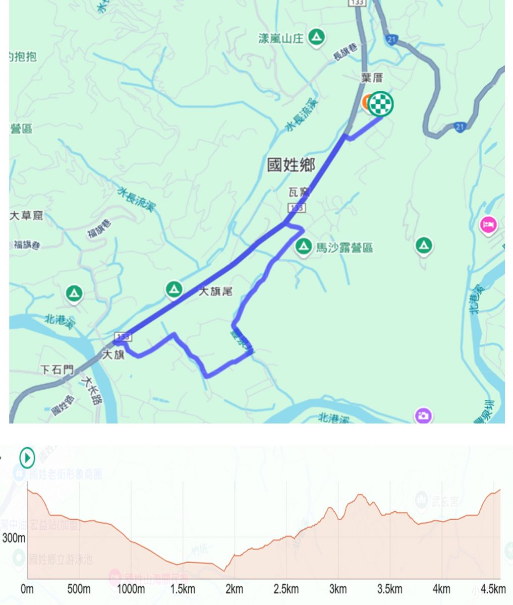 挑戰組 (13公里) 楞嚴宮(會場)集合出發➤左轉133線(0K+850)➤成功街(全聯)右轉➤中興路(成功雕像)➤左轉國姓路(國姓老街)➤鄉公所➤護國宮➤右轉國姓路➤(投84線)➤石門福德祠➤長北路➤左轉台21線(23K+700)➤台21線(21K+450)左轉133縣道(全家水長流店)➤133縣道(0K+850)明輝汽車修配廠左轉➤楞嚴宮(會場)➤完成賽事