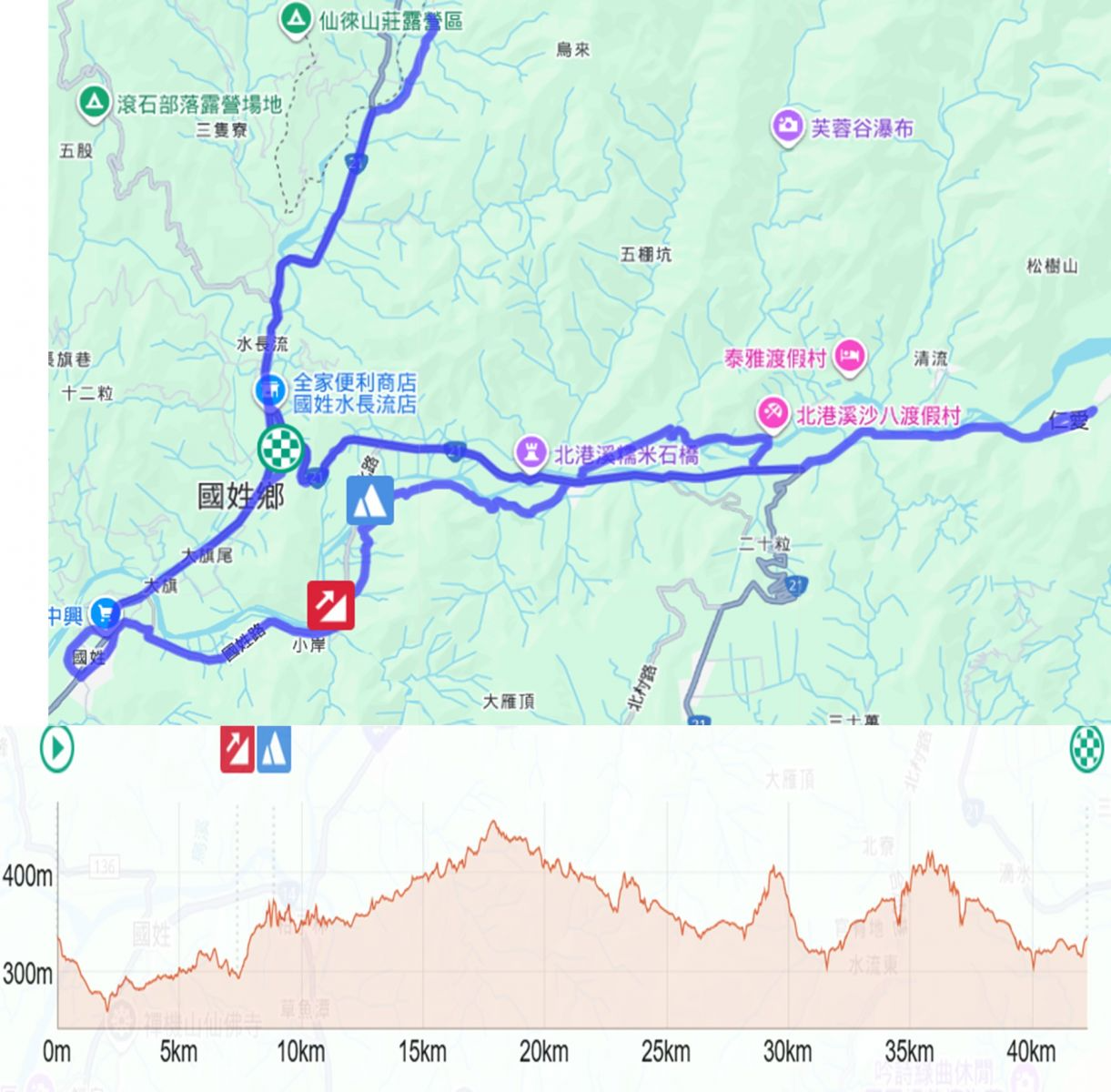 全馬組 (42.195公里) 楞嚴宮(會場)集合出發➤左轉133線(0K+850)➤成功街(全聯)右轉➤中興路(成功雕像)➤左轉國姓路(國姓老街)➤鄉公所➤護國宮➤右轉國姓路➤(投84線)➤石門福德祠➤投84(3K+300岔路)右轉往小胖露營區➤台21線(26K+000)北港國小右轉➤梅林派出所直行➤台21線(28K+800)左轉北原路(投80線)➤中華路(投80線)➤中原部落三岔路右轉清流梅鄉自行車道➤中華路三岔路(投80線)左迴轉➤台21線(28K+800)右轉➤台21線北梅橋(28K+250)右轉北原路➤北圳巷左轉➤台21線梅林派出所右轉➤北港溪橋(糯米橋)➤台21線21km (21K+450)右轉水長流➤長春橋➤長福一號橋➤台21線(17K+500)富山商店右轉➤長雙橋路口右轉➤長雙巷39號折返➤左轉台21線(17K+500)富山商店➤長福一號橋-➤長春橋➤右轉133縣道(全家水長流店)➤133縣道(0K+850)明輝汽車修配廠左轉➤楞嚴宮(會場)完成賽事