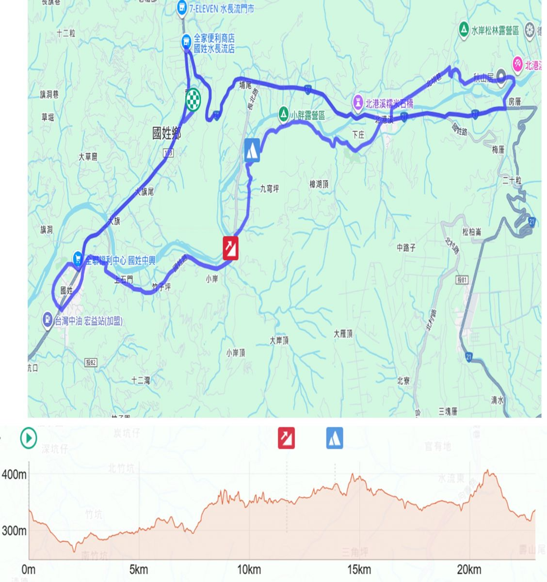 超半馬組 (23公里) 楞嚴宮(會場)集合出發➤左轉133線(0K+850)➤成功街(全聯)右轉➤中興路(成功雕像)➤左轉國姓路(國姓老街)➤鄉公所➤護國宮➤右轉國姓路➤(投84線)➤石門福德祠➤投84(3K+300岔路)右轉往小胖露營區➤台21線(26K+000)北港國小右轉➤梅林派出所➤台21線北梅橋(28K+250)左轉北原路➤北圳巷左轉➤台21線梅林派出所右轉➤北港溪橋(糯米橋)➤台21線(21K+450)左轉133縣道(全家水長流店)➤133縣道(0K+850)明輝汽車修配廠左轉➤楞嚴宮(會場)➤完成賽事