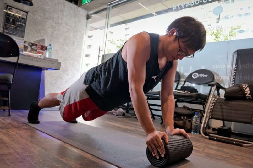 藉由 Vyper By Hyperice 2.0 極速震動滾筒訓練肌耐力。(圖片來源:運動筆記/徐拔)