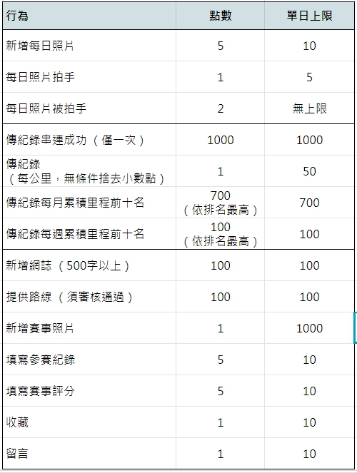- 如何獲得點數?參與運動筆記的各項互動均可獲得點數,包括收藏賽事、文章、相片、路線,寫網誌、傳照片、新增參賽紀錄、賽事評分等,未來會增加更多獲得點數的行為。