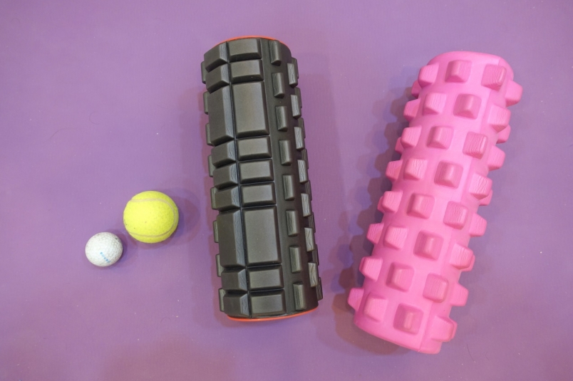 常見的居家按摩輔助工具:高爾夫球、網球、按摩滾筒、狼牙棒按摩滾筒。(圖片來源:吳俊毅)