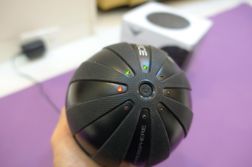 HYPERSPHERE 極速按摩球,利用原廠附的 AC 充電器快速充電,內建充電式鋰電池,不需另外購買電池,球體上的電池電量 LED 指示燈(綠、紅),顯示按摩球的電量狀況。(圖片來源:吳俊毅)