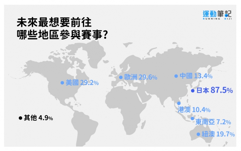 25%填答者有海外跑馬經驗,其中又以參加日本的賽事為最多。「跑旅」是近年很流行的旅遊方式,這次問卷調查結果也顯示「觀光旅遊」高居跑者從事海外賽事最主要的原因第一位,有高達87.5%的填答者未來最想前往日本參賽。