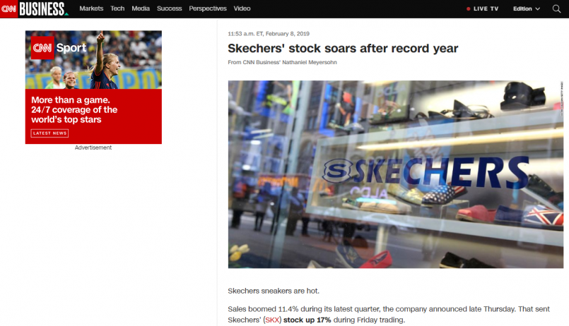 全球第二大運動鞋品牌-SKECHERS (紐約證券交易所股票代碼:SKX)上週四(1/31)收盤後隨即公佈 2018 年第四季和全年業績。SKECHERS 在 2018 全球鞋業業績低迷的劣勢中,一鳴驚人,在 2/8 盤前交易時段股價飆升 19.3%,且由於零售、批發通路及國際市場與美國國內業務都有均衡增長,2018 整年度的營業額同比增長 11.5%,並達成創歷史紀錄的 46 億美元的驚人佳績(折合新台幣約 1,420 億)。