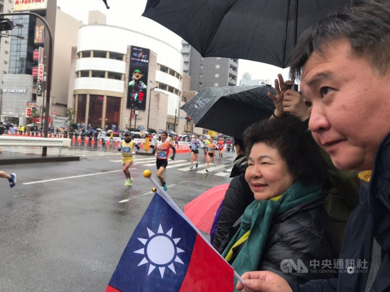 台灣「馬拉松寶貝」曹純玉 3 日在東京馬拉松飆出好成績,打破台灣女子馬拉松全國紀錄。她感謝男友教練陳囿任,也感謝總統府秘書長陳菊在路旁為她大聲加油。(圖片來源:羊角姐妹神秘加油團)