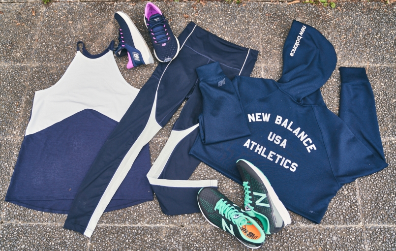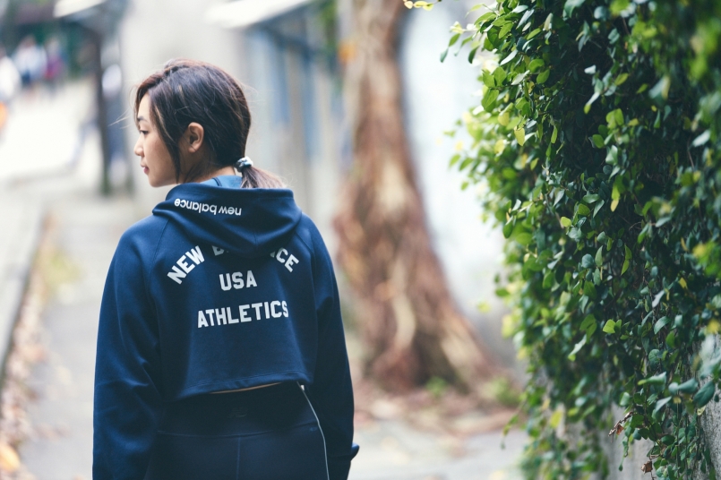 NB DRY 系列:短版運動連帽長袖上衣 NT$ 2,680;異素材拼接運動背心 NT$ 1,180;透氣拼接運動九分褲 NT$ 2,680(圖片來源:Raymond)