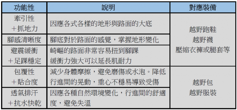 長距離越野裝備所考量的功能性(表格來源:Mong Kwung Wong自行整理)