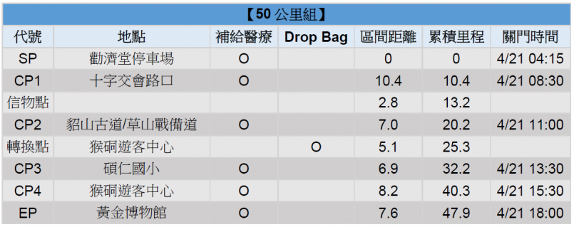 50 公里組各 CP 點時間(圖片來源: 整理至 TNF 官網)