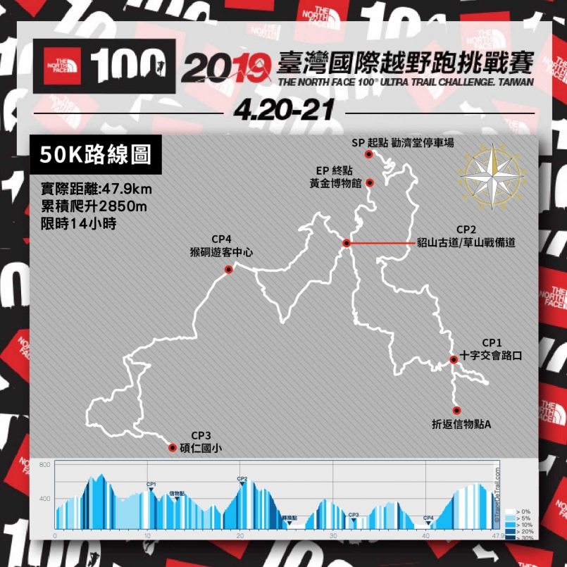 相較於 20 公里以下的短距離, 50 公里以上的長距離越野賽,對於賽道的認識必須更加詳細,如此一來才能明確我們的訓練方向及賽事策略,故官方網站所提供的資訊就顯得更加重要。以下就以 TNF100 的 50 公里組為例子說明,請見下圖: