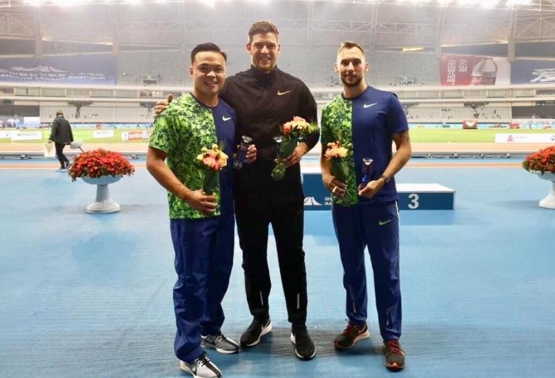上週鄭兆村(左)於「 2019 鑽石聯賽—上海站」擲出 87 米 12 早早達標奧運,賽後他也與競爭對手 Hofman(中)以及 Krukowski (右)合影。