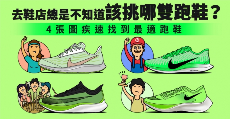 現代跑鞋百百種,鞋子科技也持續推陳出新,但令人眼花撩亂的科技名詞這麼多種,去鞋店看來看去總是不曉得該購買哪一雙跑鞋?不用擔心,今天只要靠這四張圖,對應最貼近你內心的情境,更讓你不會眼睛花花,輕鬆挑選符合自己需求的跑鞋喔!