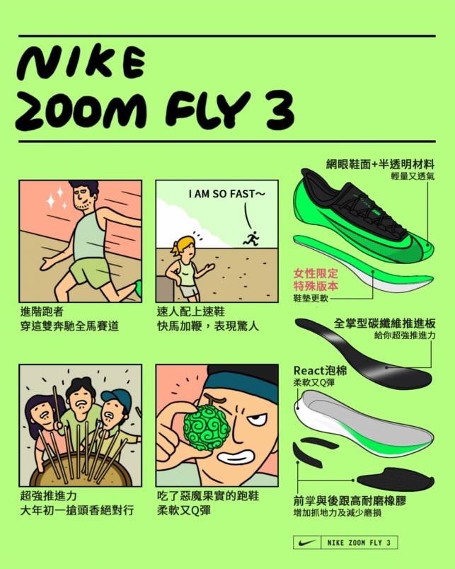 如果你是跑步狂熱者,平常也有規律的跑步訓練,且每一次馬場都希望有新的突破時,Nike Zoom Fly 3 會是你在賽道上展現速度的最佳利器喔!Nike Zoom Fly 3 針對速度跑者,特別採用全掌型碳纖維推進板,讓你在帥氣之虞,還可以給你超強推進力,除此之外,讓你大年初一不想搶到頭香都難。但千萬要小心 React 泡棉 所帶給你的回彈感,因為一不小心你可能就會跳出地球表面喔!