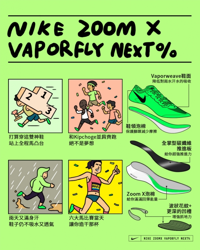 如果說 Nike Zoom Pegasus Turbo 2 是超級馬力歐的話,那麼 Nike ZoomX Vaporfly NEXT% 絕對會是音速小子。有速度神鞋著稱的 Nike ZoomX Vaporfly NEXT% 不僅採用 Vaporweave 鞋面讓你輕鬆擺脫雨水及汗水之外,那波狀花紋+更深的凹槽使你在競速時抓地力更穩健。不管你是想站上凸台,或想體驗與 Eliud Kipchoge 並肩齊跑,那就先穿上 Nike ZoomX Vaporfly NEXT% ,讓你在世界六大馬拉松造干那杯!