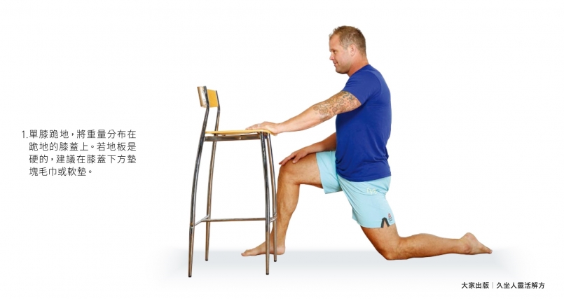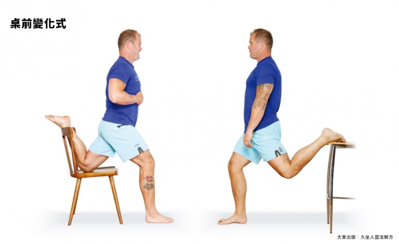 這是老牌的開髖動作,鎖定目標為髖關節屈肌群,髖部鬆開,才有辦法進入鼎鼎有名的沙發伸展(見下頁)。最棒的是,你可以直接在桌子前面做。